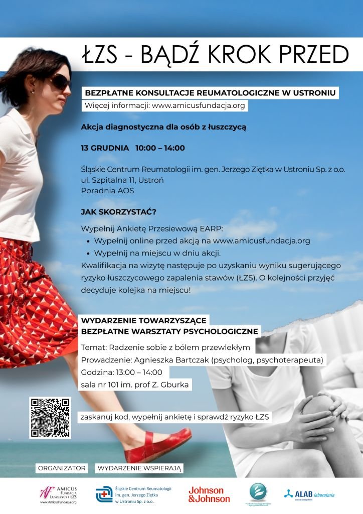 Inicjatywa „ŁZS – bądź krok przed” to program Fundacji AMICUS, który pomaga wcześnie rozpoznać łuszczycowe zapalenie stawów (ŁZS) u osób z łuszczycą. Dzięki testowi przesiewowemu EARP możesz ocenić objawy, a jeśli wynik będzie pozytywny – umówisz darmową konsultację reumatologiczną w ramach akcji w czterech ośrodkach w Polsce.