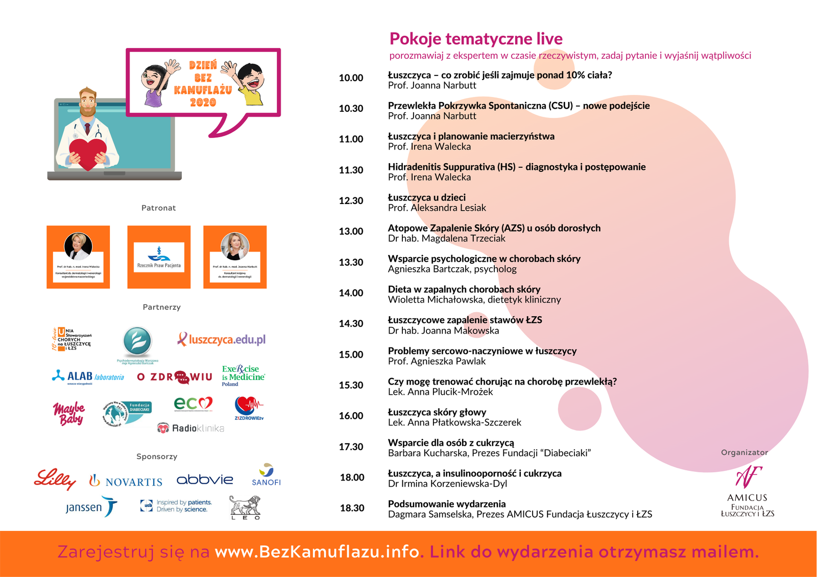 Tym razem, ze względu na bezpieczeństwo uczestników w związku z występowaniem koronawirusa, wydarzenie odbędzie się za pośrednictwem internetu. W pokojach tematycznych będzie można zasięgnąć opinii wielu specjalistów – dermatologa, alergologa, kardiologa, diabetologa, psychologa, dietetyka, a także porozmawiać w ramach spotkań z organizacjami wspierającymi pacjentów.