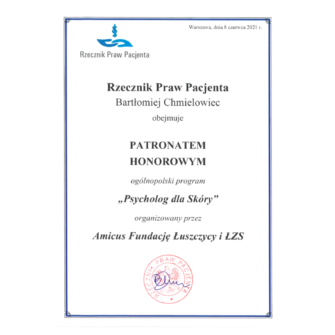 Psycholodzy oraz gabinety, których kadra psychologiczna weźmie udział w szkoleniu, otrzymają Certyfikat „Psycholog dla Skóry” oraz specjalne oznaczenie z logo programu. Każdy uczestnik szkolenia uzyska także imienny certyfikat potwierdzający zdobytą wiedzę i umiejętności. Dodatkowo adres gabinetu zostanie umieszczony na platformie edukacyjnej www.psychologdlaskory.pl.