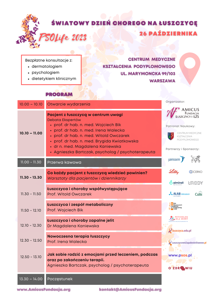 Uczestnicy wydarzenia będą mieli wyjątkową okazję posłuchać wykładów znakomitych specjalistów dermatologii, reumatologii, a także psychologa klinicznego. Swoim autorytetem wydarzenie wspierają prof. dr hab. Joanna Narbutt, konsultant krajowa ds. dermatologii i wenerologii, prof. dr. hab. Irena Walecka, prof. dr hab. Brygida Kwiatkowska, prof. dr hab. Ewa Mojs, dr Mariusz Sikora. Podczas wydarzenia będzie można zadawać pytania prowadzącym.